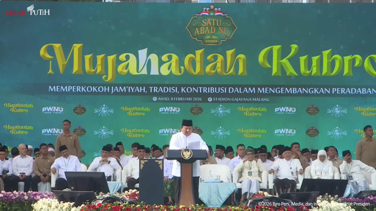 Presiden Prabowo Subianto hadir dalam acara puncak dan menyampaikan apresiasi atas peran NU selama satu abad dalam menjaga persatuan bangsa dan nilai-nilai kebangsaan. Presiden menegaskan bahwa NU memiliki kontribusi besar dalam membangun kehidupan beragama yang moderat dan menjaga keutuhan Negara Kesatuan Republik Indonesia.