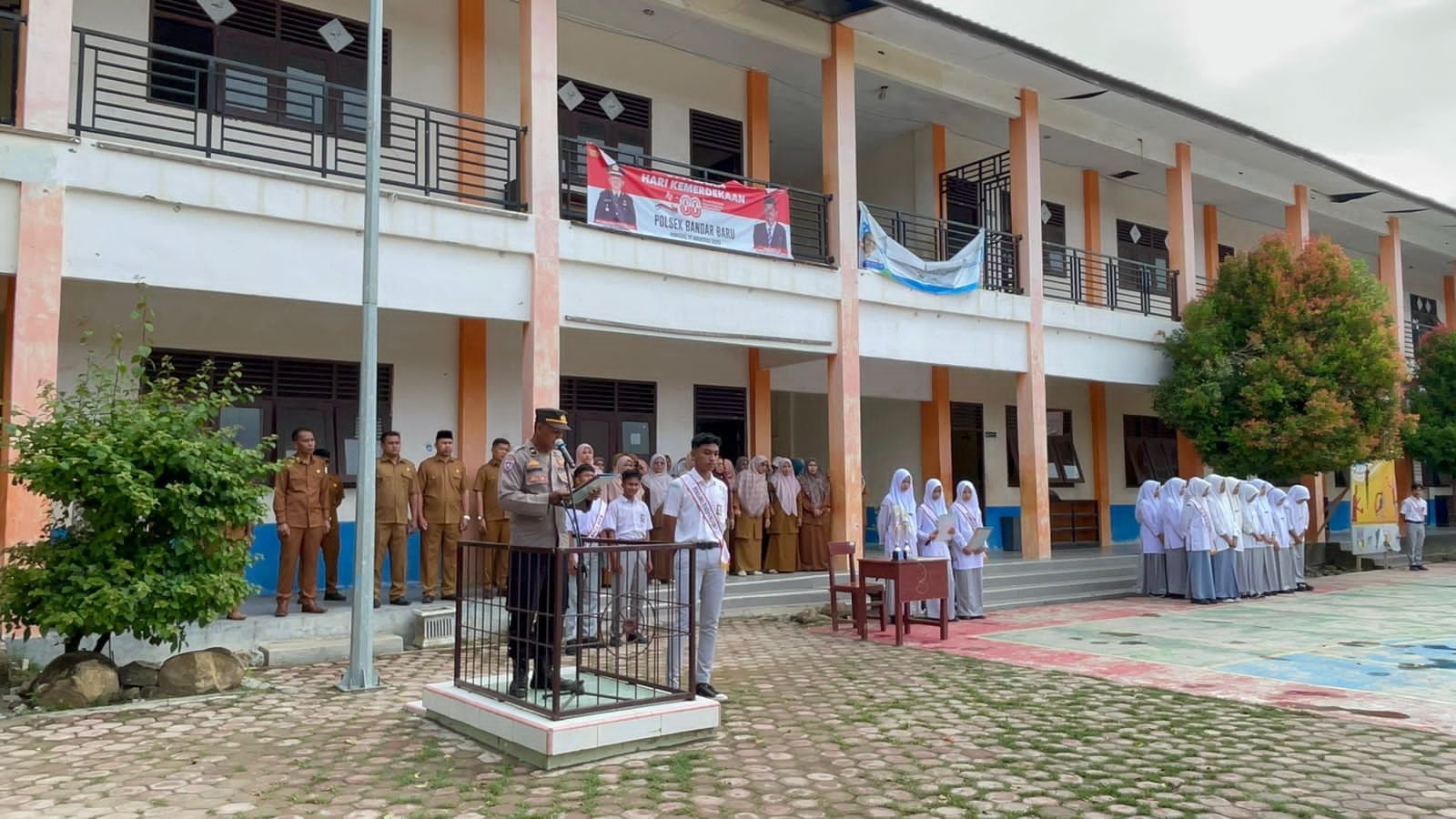 Turut hadir kepala sekolah, dewan guru, staf, serta seluruh siswa-siswi yang mengikuti upacara dengan khidmat.