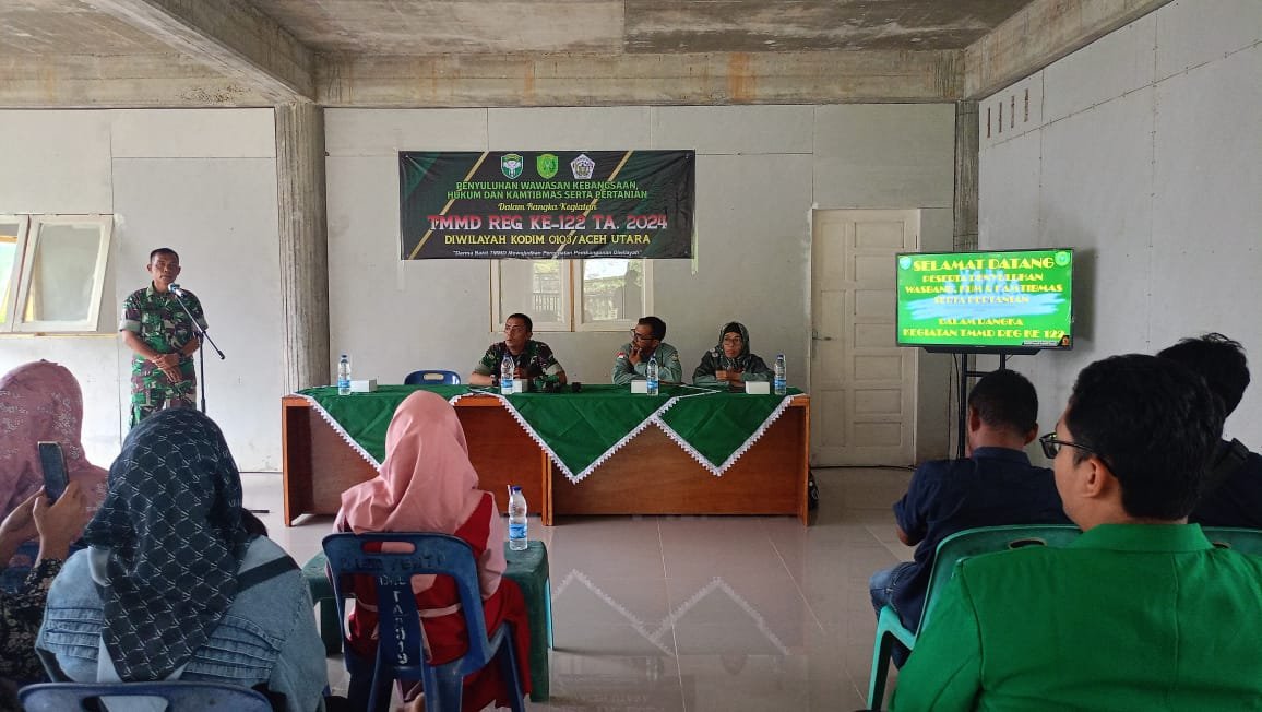 LHOKSEUMAWE- PSIKODAY.COM | Satuan tugas (Satgas) TNI Manunggal Membangun Desa (TMMD) reguler ke-122 Kodim 0103/Aceh Utara memberikan penyuluhan wawasan kebangsaan, Hukum dan Kamtibmas serta Pertanian kepada masyarakat di Gampong Paloh Punti, Kecamatan Muara Satu, Kota Lhokseumawe, Selasa (08/10/2024).